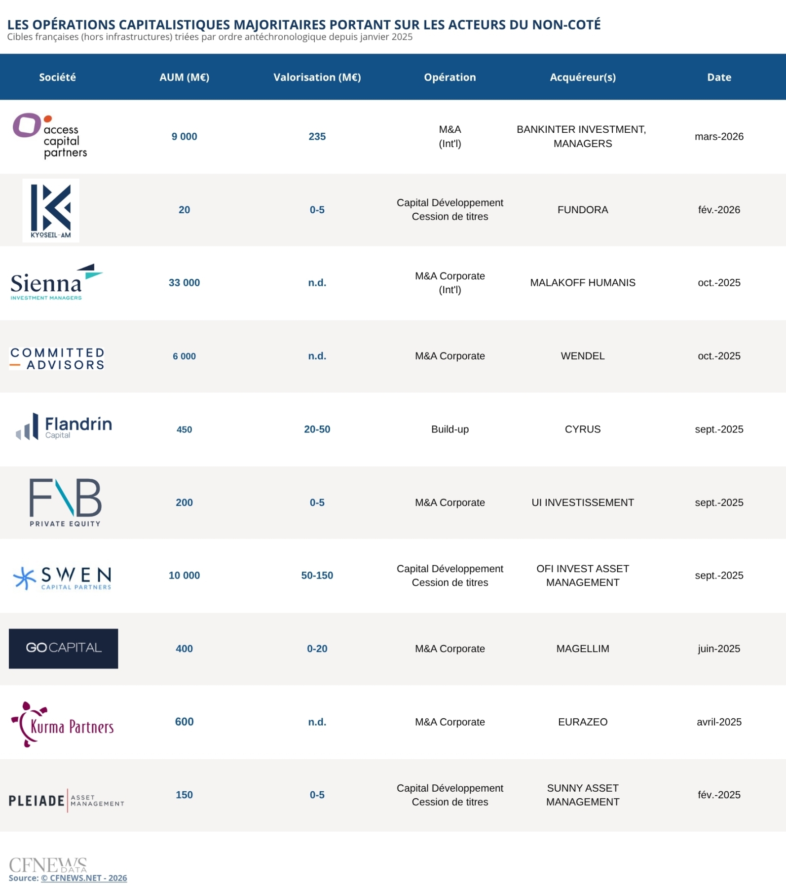 LES OPÉRATIONS CAPITALISTIQUES MAJORITAIRES PORTANT SUR LES ACTEURS DU NON-COTÉ -  ©CFNEWS.NET - 2026