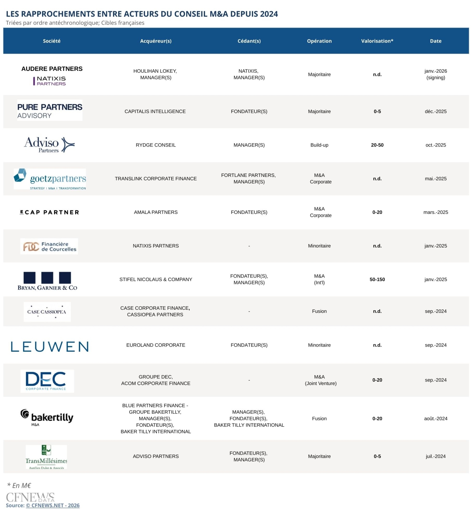 LES RAPPROCHEMENTS ENTRE ACTEURS DU CONSEIL M&A DEPUIS 2024 ©CFNEWS.net - 2026