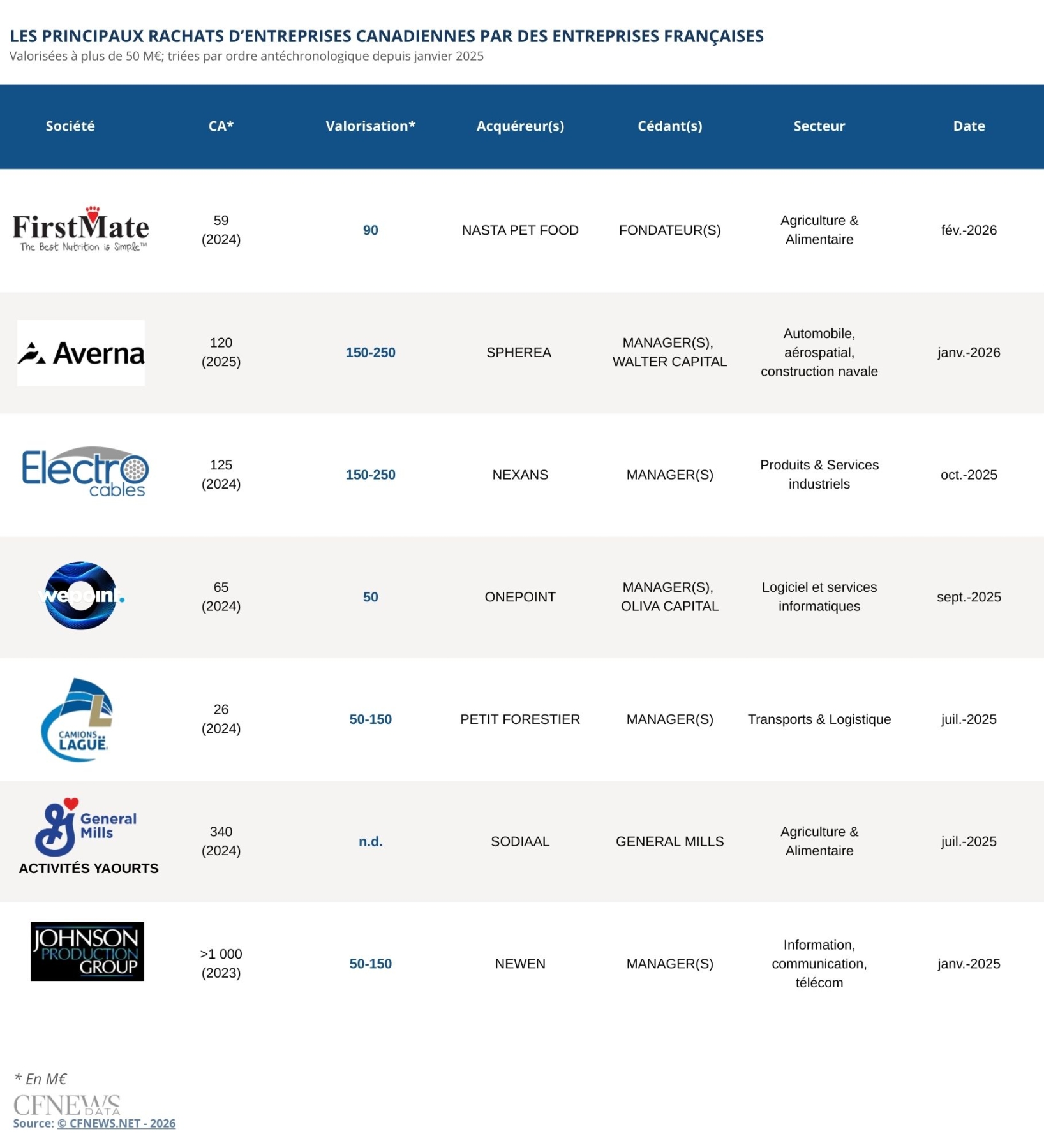 TAB LES PRINCIPAUX RACHATS D’ENTREPRISES CANADIENNES PAR DES ENTREPRISES FRANÇAISES ©CFNEWS.net -2026