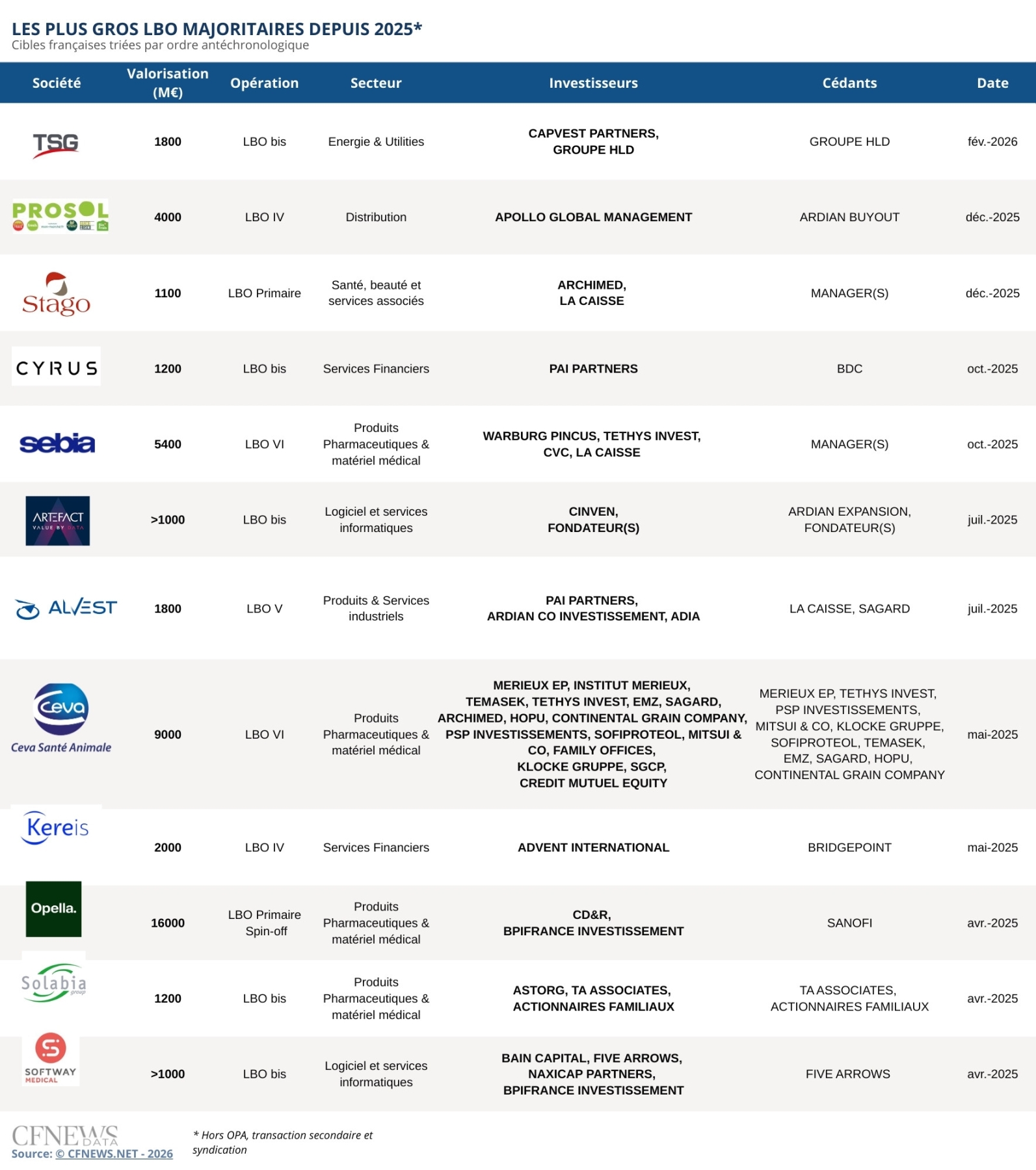 TAB LES PLUS GROS LBO MAJORITAIRES DEPUIS 2025. ©CFNEWS.net - 2026