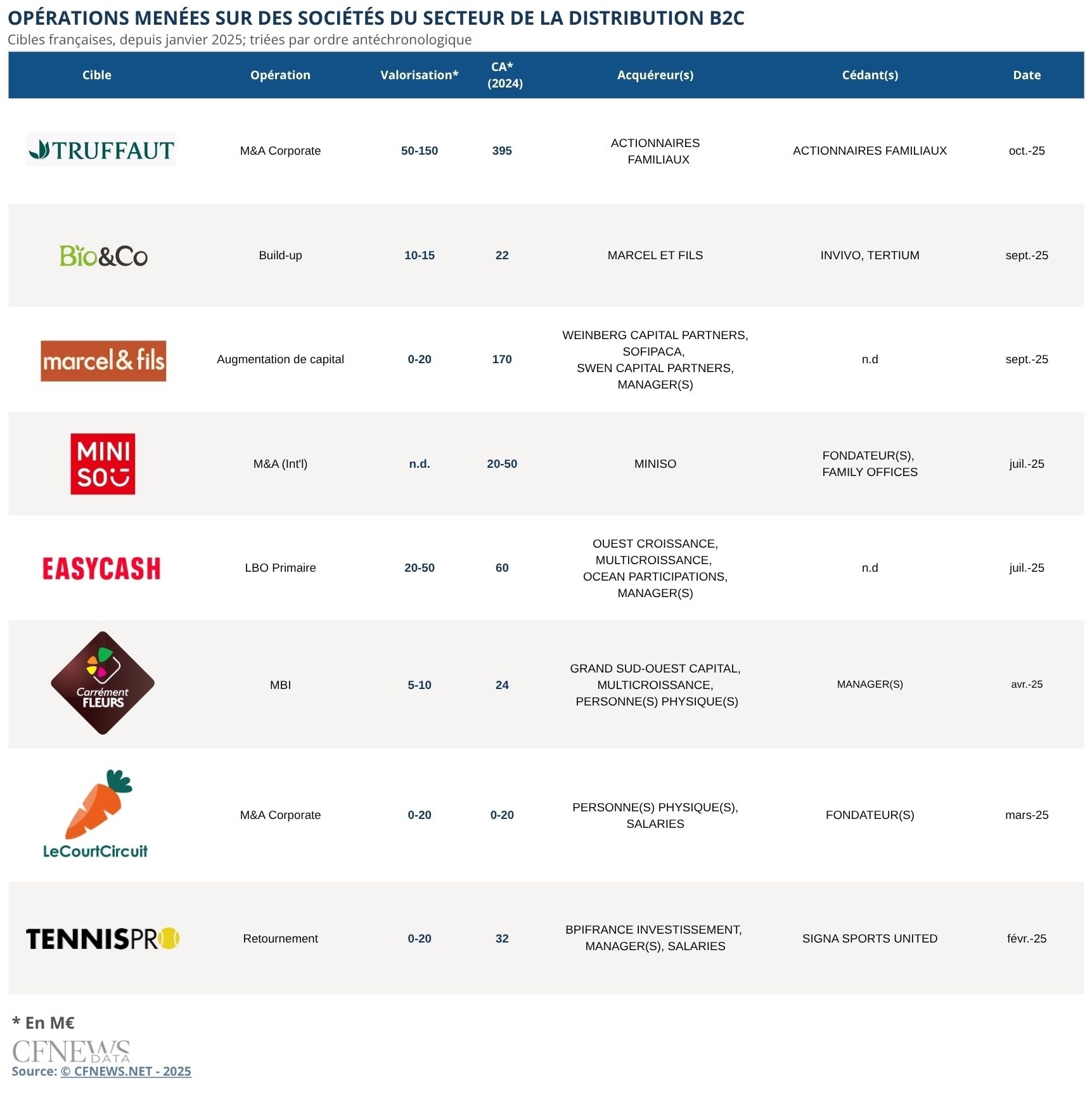 Fondé en 1824 d’abord comme un groupe horticole avant d’ouvrir des jardineries, Truffaut exploite aujourd’hui 62 magasins en France, principalement dans les agglomérations, et dispose d’une entreprise de production dans le Loiret, Roses Anciennes André Eve. Les magasins distribuent une gamme large, de l’outillage de jardin aux plantes en passant par le mobilier, les arts de la table, loisirs créatifs et la décoration. Basé en région parisienne à Lisses dans l’Essonne, le groupe avait rejoint la galaxie du belge Louis Delhaize en 1990. Employant environ 3 000 collaborateurs, dirigés par Sébastien Attina, CEO, Truffaut affichait 395 M€ de chiffre d’affaires en 2024 et 20 à 30 M€ d’Ebitda.